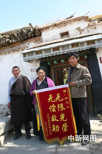 今天中午,來自云南昭通水富縣向家壩的進(jìn)藏種菜工稅代超捧著一面繡有“無限光榮,無償救助”的錦旗,走進(jìn)了這個曾是他生命庇護(hù)所的普通藏家小院,向兩位老人深深地鞠了一躬。