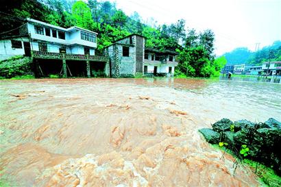 恩施市龍鳳壩鎮(zhèn)三河村的居民住宅被山洪圍困 新華社發(fā)