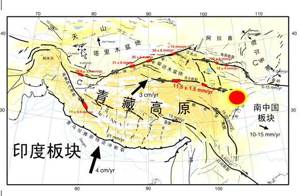 印度板塊向亞洲板塊俯沖,造成青藏高原快速隆升。高原物質(zhì)向東緩慢流動(dòng),在高原東緣沿龍門山構(gòu)造帶向東擠壓,遇到四川盆地之下剛性地塊的頑強(qiáng)阻擋,造成構(gòu)造應(yīng)力能量的長(zhǎng)期積累,最終在龍門山北川-映秀地區(qū)突然釋放。