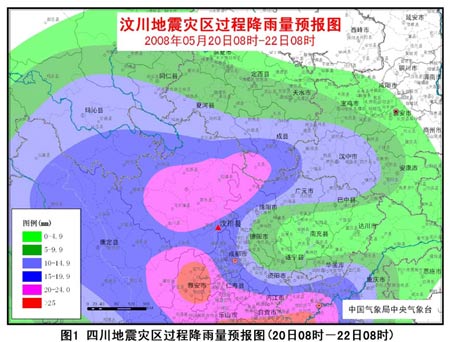 20-21日,震中及其附近地區(qū)將有一次中雨過(guò)程,四川汶川、北川、理縣、茂縣、綿竹等重災(zāi)區(qū)的降雨量有8-22毫米,四川松潘、黑水、馬爾康以及甘肅文縣降雨量可達(dá)25-40毫米(圖1),并伴有短時(shí)雷電、雷雨大風(fēng)等強(qiáng)對(duì)流天氣。22日,震區(qū)還將有2-8毫米的降雨(圖2)。需注意局地強(qiáng)降雨給抗震救災(zāi)工作帶來(lái)的不利影響。