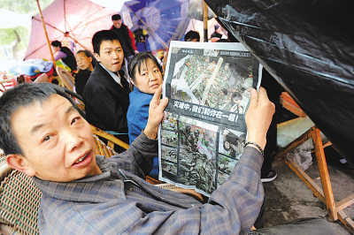 綿陽安縣人民公園安置點(diǎn),為災(zāi)區(qū)群眾提供了最新的報紙。(王科/攝)