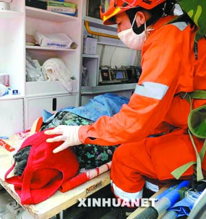 “164個(gè)小時(shí)!”昨日上午10時(shí)30分許,在北川縣城內(nèi),一名國(guó)家地震災(zāi)害緊急救援隊(duì)員興奮地說,他們將一名被困廢墟下老人成功救出,這是目前震后在廢墟中存活時(shí)間最長(zhǎng)的老人。