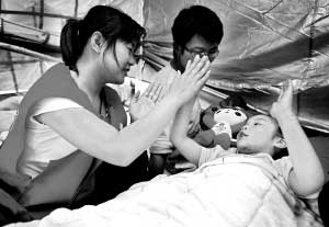 5月20日,綿陽市中心醫(yī)院外的醫(yī)療帳篷里,唐山大地震中存活下來的孤兒黨育新看望這次地震中存活下來的孤兒鑫怡,兩個人玩起了游戲。