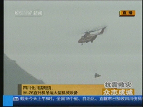 中新網(wǎng)綿陽(yáng)5月26日電(霍潺)今天上午十一點(diǎn)零五分左右,一架紅色米-26直升機(jī)吊裝了一臺(tái)重約十三點(diǎn)二噸的重型挖掘機(jī)已起飛,前往唐家山堰塞湖壩體,大約二十多分鐘可以往返。