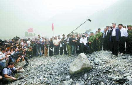 5月24日,國務院總理、國務院抗震救災總指揮部總指揮溫家寶重返四川地震震中汶川縣映秀鎮(zhèn)時,接受中外記者的聯(lián)合采訪。