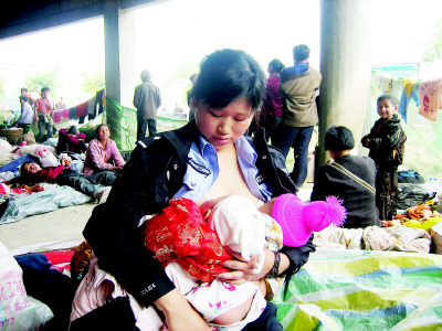 資料圖:蔣曉娟一手一個為災(zāi)區(qū)嬰兒哺乳。
