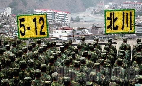 14時(shí)28分,某鐵血師選擇了這個(gè)時(shí)間,在北川縣城奏響哀樂,上萬響鞭炮同時(shí)鳴響。512名某鐵血師官兵,面朝北川,默哀、鞠躬、告別!俺镣窗У勘贝ㄓ鲭y同胞”的橫幅掛起,軍人們雙手折出來的花朵,編織出兩塊巨大的牌匾,上面寫著“5·12”、“北川”。哀樂響起,官兵默然,每個(gè)人胸前別著的那一朵寫有“哀念”兩個(gè)字的白色紙花,在風(fēng)中輕輕飄揚(yáng)。鞭炮的鳴響漸漸遠(yuǎn)去,戰(zhàn)士們將花圈送到兩塊牌匾之間,該師師長曲新勇和政委高偉率先捧起黃色雛菊,走到崖邊,眺望著即將離別的北川縣城,不約而同一個(gè)立正,莊嚴(yán)的軍禮獻(xiàn)給遇難同胞。