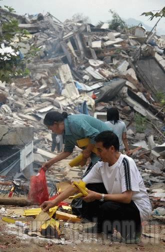 坐在老縣城畜牧局宿舍樓下,46歲的陳幫金無言地看著幫工扎紙人。這里,曾經(jīng)充滿了他和妻子的歡笑。但地震那天,44歲的妻子在新縣城天然氣公司附近遇難,按照當(dāng)?shù)仫L(fēng)俗,陳幫金要等紙人扎好后,和兒媳、弟妹一起,翻過廢墟到妻子遇難的地方祭拜。此景悲涼,陳幫金一家仍充滿了感激:“全靠政府政策好,從13日起就開禁了,不然我們都不曉得什么時(shí)候才能回來拜一下!