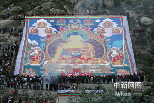 雪頓節(jié)最早是一種宗教活動(dòng),是老百姓以酸奶對(duì)寺院行長(zhǎng)凈、夏安居之事后解禁僧人的敬奉。十七世紀(jì)下半葉,雪頓節(jié)逐漸演變和固定成以藏戲匯演和展佛為主、文娛與宗教相結(jié)合的重要節(jié)日,所以又被稱為“藏戲節(jié)”、“展佛節(jié)”。自去年起。該節(jié)升格為“中國(guó)拉薩雪頓節(jié)”,成為國(guó)家級(jí)旅游、文化、經(jīng)貿(mào)節(jié)慶。今晨有上萬游客及信眾在現(xiàn)場(chǎng)參觀了哲蚌寺展佛。