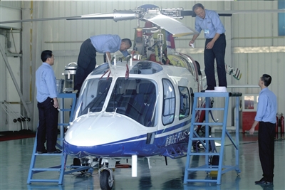 機務人員在對一架直升機進行保養(yǎng)檢查工作。本報記者 董世彪 攝