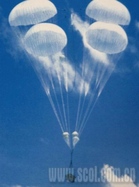 “神七”返回艙回收傘采用異型設(shè)計(jì),由紅白兩種顏色組成,傘兩邊的強(qiáng)力要比中間高。屆時(shí),96根傘繩撐起回收傘,“神七”飛船返回艙將借助回收傘以完美的姿勢(shì)落地。