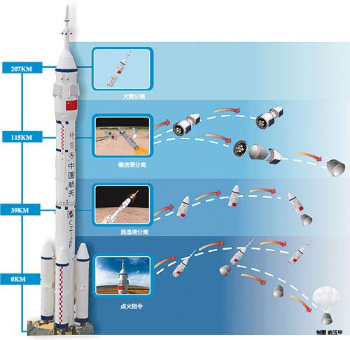從火箭發(fā)射前30分鐘到起飛后120秒、飛行高度在39千米時(shí)逃逸塔分離,以及從120秒到200秒左右、飛行高度115千米時(shí)整流罩分離這兩個(gè)時(shí)間空間段內(nèi),萬(wàn)一發(fā)生意外緊急狀況時(shí),逃逸塔就會(huì)啟動(dòng),靠固體燃料火箭發(fā)動(dòng)機(jī)提供巨大的瞬間推力,將航天員所在的飛船從火箭上拉出來(lái),帶著航天員偏離火箭的運(yùn)行軌道,逃離險(xiǎn)境,然后借助降落傘和緩沖裝置安全降落到地面。由于增加了逃逸系統(tǒng),長(zhǎng)征二號(hào)F火箭的安全性指標(biāo)由過(guò)去發(fā)射100次可能出現(xiàn)3次危及航天員生命的問(wèn)題,減少到現(xiàn)在發(fā)射1000次才可能發(fā)生3次這樣的事故,達(dá)到了國(guó)際先進(jìn)水平。