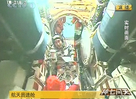 中新網(wǎng)9月25日電 25日18時25分許,神舟七號三名航天員陸續(xù)進艙。第一名進艙的是景海鵬,第二名進艙的是劉伯明,最后,指令長翟志剛也開始進入。