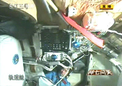 劉伯明在飛船軌道艙進(jìn)行軌道艙狀態(tài)檢查和艙外航天服的組裝與測(cè)試等工作。(電視截圖)