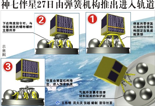 圖表:神七伴星27日由彈簧機(jī)構(gòu)推出進(jìn)入軌道 (圖片來源:新華網(wǎng))