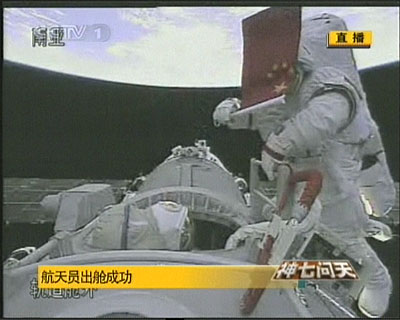 中新網(wǎng)9月27日電 北京時(shí)間9月27日下午16時(shí)43分,中國“神七”載人飛船航天員翟志剛順利出艙,實(shí)施中國首次空間出艙活動(dòng)。16時(shí)58分,翟志剛順利返回軌道艙,完成出艙任務(wù),這標(biāo)志著中國歷史上第一次太空行走成功完成。在太空行走過程中,翟志剛將一面五星紅旗在太空中揮動(dòng)。