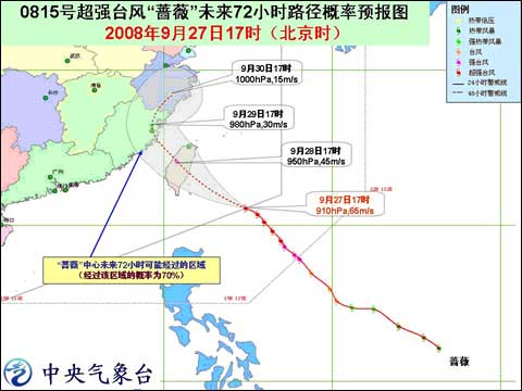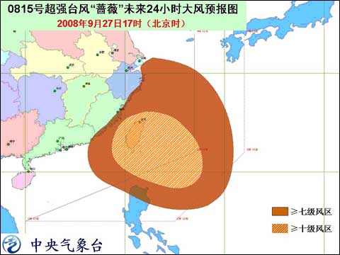 中新網(wǎng)9月27日電 據(jù)中國天氣網(wǎng)消息,中央氣象臺2008年9月27日18時發(fā)布臺風(fēng)紅色警報稱:預(yù)計,今年第15號超強(qiáng)臺風(fēng)“薔薇”將以每小時20-25公里的速度向西北方向移動,逐漸向臺灣東部一帶沿?拷,將于明天中午到夜間在臺灣宜蘭到臺東一帶沿海登陸。