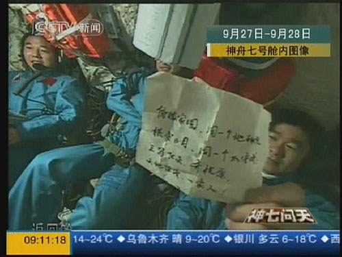 電視畫面顯示,三位航天員面帶微笑,表情輕松愉悅,劉伯明還向鏡頭展示了一張字條。