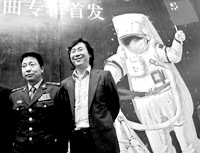 發(fā)布會上首次公布了隨“神七”飛船飛天的100多首歌曲,其中包括全新創(chuàng)作的15首航天歌曲專輯。楊利偉表示,“我深愛《我為祖國感到驕傲》這首歌,每一次聽到都會感到心情激動。那就是我們航天員回到地球打開艙門時最想說的第一句話,是我們的真情感受!北九_晚會的音樂總監(jiān)、蒙族音樂家恩克巴雅爾也是 《我為祖國感到驕傲》的曲作者,他介紹說:“這一百多首歌曲有郭蘭英演唱的《我的祖國》、宋祖英演唱的《望月》以及成龍演唱的《男兒當(dāng)自強》等!(記者 李澄/文 鄒紅/攝)