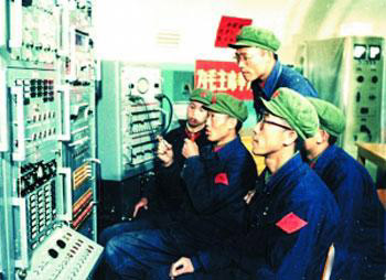 劉慶貴(前排)在“東方紅一號(hào)”人造衛(wèi)星發(fā)射指揮臺(tái)工作。王艷梅/供圖