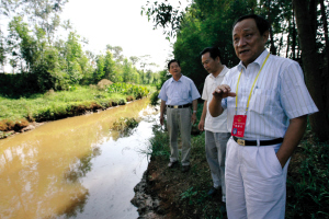 三位暗訪的省人大代表在排放口仔細(xì)觀察!斑@里肯定存在偷排污水現(xiàn)象,否則怎么會淤積這么厚的黑泥?”省人大環(huán)資委副主任委員潘大林說。他還指給記者看,排放口上游河岸兩邊是黃泥,到下游就變成黑色,水面也開始漂浮油污。