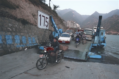 昨日,秭歸縣香溪渡口,摩托和汽車從汽渡上開出,經(jīng)過175米水位線。
