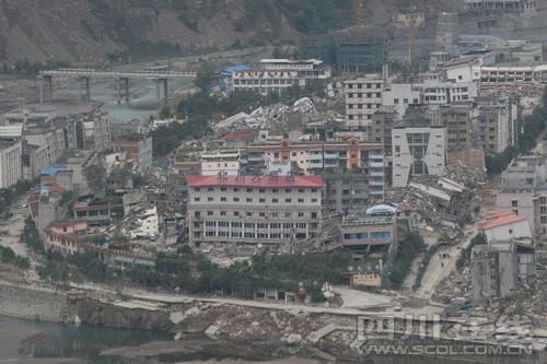 山谷中,青山綠水間的北川縣城盡收眼底,藍色、橙色、紅色的屋頂錯落有致;湔江上,連接新老縣城的吊橋清晰可見;老縣城里,北川電力公司藍紫色的框架格外惹眼;新縣城里,毛壩中學(xué)操場上的國旗迎風(fēng)飄揚。站在這里,可以看到菜市里熙熙攘攘的人群;可以看到三輪車夫在路上攬客……地震發(fā)生后,難以計數(shù)的巨石將三倒拐壓得嚴(yán)嚴(yán)實實,所有的樓房無一例外遭到巨大破壞。