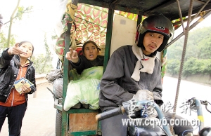三輪車隊不得不重返210國道。四輛三輪車上,包括司機(jī),共搭載了11人。一輛車便是一個家庭單元:夫妻或者父母兒女。一行人上月18日從廣東出發(fā),一路經(jīng)廣西、貴州,到昨日,已奔波了14天。