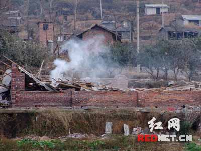 冷水江市巖口鎮(zhèn)農(nóng)科村一鞭炮廠倉(cāng)庫(kù)被炸為廢墟。