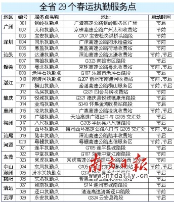 春運期間,將在主干公路上設(shè)立29個由省廳掛牌的春運執(zhí)勤服務點(見右表)。服務點由當?shù)毓矙C關(guān)派民警日夜駐守,重點檢查7座以上營運客車和危險化學品運輸車輛,嚴格查處客車超員和無牌無證、報廢車上路行駛以及農(nóng)用車、拖拉機載人等嚴重交通違法行為,其中節(jié)前春運執(zhí)勤服務點要從1月5日起即開始運作。各地市還根據(jù)實際在主干公路和交通流量大的路段設(shè)置119個春運執(zhí)勤服務點,配備足夠的警力和裝備。如果駕駛員在旅途中遇到問題,可以及時通過這些執(zhí)勤服務點向有關(guān)部門求助。
