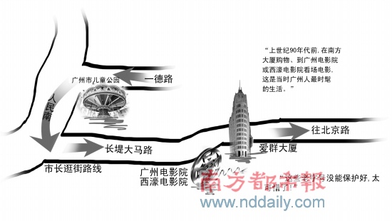 離開(kāi)兒童公園,張廣寧沿人民南路向南走去。當(dāng)看到廣州電影院和西濠電影院的招牌時(shí),張廣寧還回憶說(shuō),上世紀(jì)90年代前,在南方大廈購(gòu)物、到廣州電影院或西濠電影院看場(chǎng)電影,這是當(dāng)時(shí)廣州人最時(shí)髦的生活。眼前,廣州電影院已變成一家KTV,而西濠電影院則變成了一家網(wǎng)吧。見(jiàn)此情此景張廣寧立即要求致電主管部門(mén),了解這幾家老字號(hào)的產(chǎn)權(quán)及消失原因。