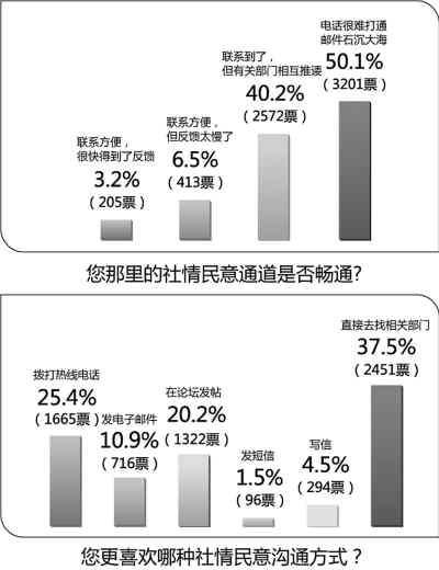 調(diào)查顯示,68.7%的網(wǎng)友不知道所在省區(qū)市的政府(省長、主席、市長)熱線、信箱或者其他聯(lián)系方式,96.8%的網(wǎng)友認(rèn)為“不暢通”。有1/3參與調(diào)查的網(wǎng)友撥打過政府熱線或是給政府信箱寫過信,但是其中僅有3.2%的人反映的問題及時得到了反饋,對身邊民情通道的暢通表示滿意。6.5%的網(wǎng)友認(rèn)為反饋太慢,40%的網(wǎng)友遭遇過相關(guān)部門推諉,更有超過一半的網(wǎng)友表示給政府民情通道的電話很難打通,郵件發(fā)出也石沉大海。