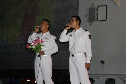 晚會首先在慷慨激昂的詩朗誦中拉開了序幕,“?凇迸炛笓]組成員在詩朗誦中回顧了護航以來的點點滴滴,贊頌護航官兵日夜值勤、戰(zhàn)風(fēng)斗浪、不僅贏得了被護商船船員的交口稱贊,也贏得了外軍的廣泛尊重。