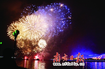 今年燃放的煙花新穎別致。許多曾在北京奧運(yùn)會開閉幕式上令世界驚艷的煙花表演品種昨日在廣州匯聚一堂,貫穿整個晚會。