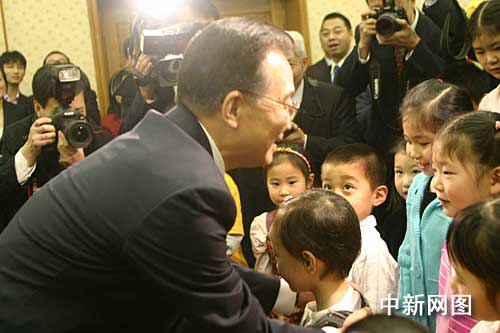 當?shù)貢r間二月一日中午,正在訪英的中國總理溫家寶來到使館看望中國駐英外交官和華僑華人。一群衣著鮮艷的孩子向溫家寶獻上鮮花,并齊聲朗誦溫家寶的詩作《仰望星空》。溫家寶親熱地探下身與孩子們問好。中新社記者 張朔攝