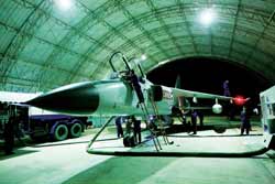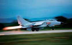 “1號(hào)請(qǐng)求起飛!薄鞍从(jì)劃執(zhí)行!币磺袦(zhǔn)備就緒后,塔臺(tái)指揮員干凈利索地下達(dá)了命令。18時(shí)25分,該團(tuán)團(tuán)長李軍第一個(gè)駕駛“飛豹”戰(zhàn)機(jī)沖向跑道。頓時(shí),機(jī)場(chǎng)上響起巨大轟鳴聲,震得記者耳朵嗡嗡作響;,加力,起飛,戰(zhàn)鷹閃著亮光騰空而起,噴著橘紅色的尾焰直沖蒼穹,最后消失在茫茫夜色之中。
