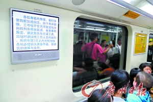 昨天上午10時(shí)29分,在運(yùn)行中的地鐵一號(hào)線熒屏上顯示出有關(guān)三號(hào)線列車故障的信息。 陳安攝