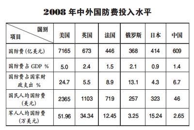 首先,應(yīng)當(dāng)看到中國國防費(fèi)的投入是適度有限的。近年來,中國的國防費(fèi)有了較大幅度的增長(zhǎng),似乎中國的國防費(fèi)已經(jīng)很多了,但如果以歷史的、聯(lián)系的,而不是以孤立的、片面的觀點(diǎn),來審視和分析中國的國防費(fèi)問題,就會(huì)得出一個(gè)中國的國防費(fèi)投入實(shí)際上并不多的客觀結(jié)論。從歷史上看,中國國防費(fèi)投入的增長(zhǎng)帶有明顯的補(bǔ)償性。根據(jù)國家統(tǒng)計(jì)局有關(guān)公開資料,從1979年到1989年,國防費(fèi)平均增長(zhǎng)為1.23%,與同期居民消費(fèi)價(jià)格總指數(shù)平均上漲7.49%相比,實(shí)際年平均負(fù)增長(zhǎng)超過6%。從1990年到1997年國防費(fèi)年均增長(zhǎng)15.8%,而同期居民消費(fèi)價(jià)格總指數(shù)平均上漲9.7%,中國國防費(fèi)排除物價(jià)因素后實(shí)際年均增長(zhǎng)只有6.1%。直到1998年國家物價(jià)指數(shù)比較平穩(wěn)之后,為降低長(zhǎng)期經(jīng)費(fèi)不足給國防和軍隊(duì)建設(shè)帶來的影響,國防費(fèi)投入才逐步有了較大幅度的實(shí)際增長(zhǎng)。在長(zhǎng)達(dá)10多年的“忍耐”過程中,中國國防和軍隊(duì)建設(shè)因經(jīng)費(fèi)不足而受到很大影響。從中國自身的情況看,中國國防費(fèi)的支出也是極其有限的。以這次兩會(huì)公布的有關(guān)數(shù)字為例,2009年中國國防費(fèi)預(yù)算比上一年度執(zhí)行數(shù)增加了14.9%,占全國財(cái)政支出預(yù)算的6.3%,與前幾年相比,所占比重略有下降,而同期教育費(fèi)增長(zhǎng)22.5%、醫(yī)療衛(wèi)生費(fèi)增長(zhǎng)20.9%、社會(huì)保障和就業(yè)費(fèi)增長(zhǎng)23.1%、環(huán)境保護(hù)費(fèi)增長(zhǎng)22.3%、保障性安居工程經(jīng)費(fèi)增長(zhǎng)199.6%,可見國防費(fèi)的增長(zhǎng)在各項(xiàng)社會(huì)事業(yè)費(fèi)的增長(zhǎng)中是相對(duì)偏低的,中國始終堅(jiān)持把主要的財(cái)力用于改善民生。再從國際上看,中國與美、英、法、俄、日等國家相比,無論是國防費(fèi)占國家國內(nèi)生產(chǎn)總值(GDP)的比重還是占國家財(cái)政支出的比重,無論是國民人均國防費(fèi)還是軍人人均國防費(fèi)投入等主要指標(biāo)都是比較低的(如右表所示)。