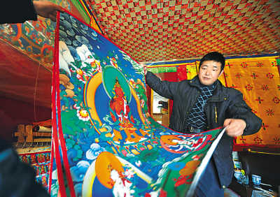 近年來,中國開展的一系列藏文化宣傳活動對藏文化的傳播也產(chǎn)生了很大的影響。拉姆說,自《藏謎》上演以后,很多顧客上門,點(diǎn)名要買楊麗萍在其中所扮演的度母為主題的唐卡。
