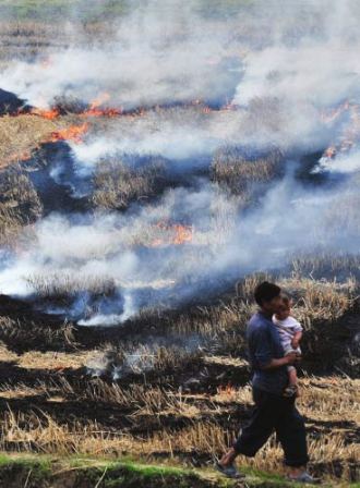 繼續(xù)往北行駛,在前方大約一公里處,一位農夫正將一大堆秸稈點燃,燒秸稈的火苗足有半米多高,騰起的濃煙讓高速路上的車輛都放慢了速度。在點燃一堆秸稈后,這名農夫又轉身到另一塊農田里,點燃堆放在那兒的秸稈……