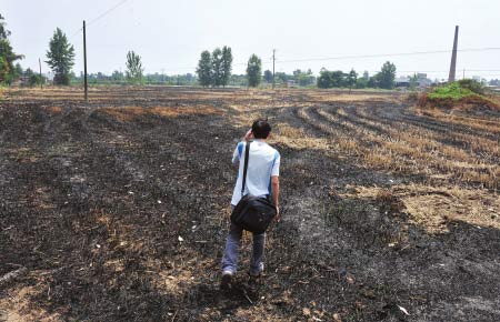“這個村地里留下的秸稈,不敢說是100%,至少90%都是燒了的!币徽诘乩锊逖淼拇迕窀嬖V記者,幾天前他就將地里的秸稈全部燒了,清理完畢后,在地里灌上水準備插秧!笆崭顧C收完麥子后,還有半茬樁子留在地里,弄起來太麻煩,一把火燒了干凈!