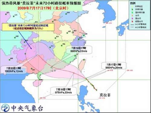 預(yù)計,“莫拉菲”將以每小時20公里左右的速度向西偏北方向移動,強(qiáng)度繼續(xù)加強(qiáng),18日早晨將進(jìn)入南海東北部海面,爾后逐漸向福建南部到廣東中部一帶沿?拷,并將于18日夜間到19日中午在這一帶沿海登陸。