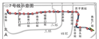 7號(hào)線全線23座車站,起于北京西客站,沿羊坊店南路向南至廣安門外大街后轉(zhuǎn)向東,沿廣安門大街、廣渠門大街向東至東四環(huán),在化工二廠東側(cè)轉(zhuǎn)向南穿越化工路后,沿垡頭西路向南至垡頭南路再轉(zhuǎn)向東進(jìn)入玻璃二廠、染料廠等工業(yè)用地范圍,線路沿規(guī)劃道路向東南敷設(shè),到達(dá)終點(diǎn)焦化廠站。(記者郭鯤)