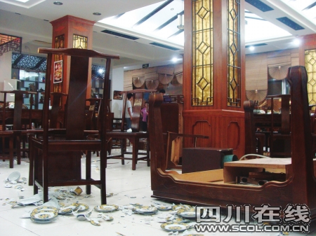洪雅縣招商局局長冷國民,帶著10余位親朋好友,也在該店“青衣江”包間內(nèi)用餐。飯后結(jié)賬時,冷國民一行與收銀員在簽單上出現(xiàn)分歧,隨之發(fā)生口角。當冷國民讓司機現(xiàn)金結(jié)清賬單后,其所帶男性客人在趕來“救場”的3名男子的帶領下,砸爛店內(nèi)桌椅、碗碟等,打傷兩名店員。