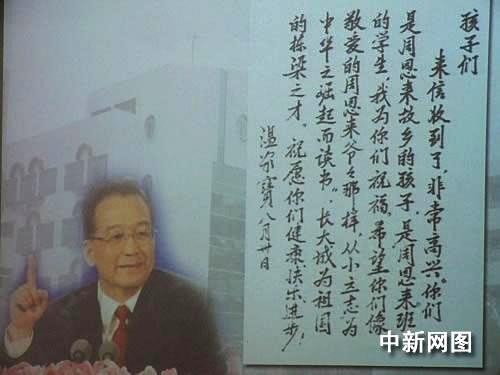 時隔兩個多月,讓孩子們激動萬分的是居然盼到了溫總理的親筆回信。溫總理在回信中說:“你們是周恩來故鄉(xiāng)的孩子,是‘周恩來班’的學生,我為你們祝福。希望你們像敬愛的周恩來爺爺那樣從小立志‘為中華之崛起而讀書’,長大成為祖國的棟梁之才!