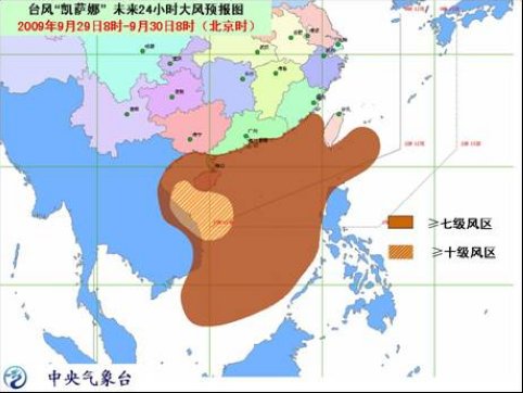 “凱薩娜”的中心29日5時(shí)位于越南廣南省(QuangNam)峴港市(DaNang)東偏南方大約170公里的南海西部海面上,就是北緯15.9度、東經(jīng)109.8度,中心附近最大風(fēng)力有13級(jí)(38米/秒),中心最低氣壓為960百帕。