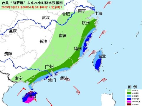 受“凱薩娜”及其外圍云系的影響,29日白天到夜間,南海大部海面、北部灣海面、瓊州海峽、海南沿海、廣西沿海將有7~9級(jí)大風(fēng),“凱薩娜”中心經(jīng)過的附近海面或地區(qū)的風(fēng)力將有10~13級(jí)大風(fēng),陣風(fēng)可達(dá)14~16級(jí);巴士海峽、巴林塘海峽、臺(tái)灣海峽、臺(tái)灣以東海面、廣東沿海、福建中南部沿海也將有6~7級(jí)大風(fēng),陣風(fēng)可達(dá)8~9級(jí);浙江東南部、福建東部、臺(tái)灣、廣東南部、海南等地有大雨或暴雨,海南南部的局部地區(qū)有大暴雨或特大暴雨。
