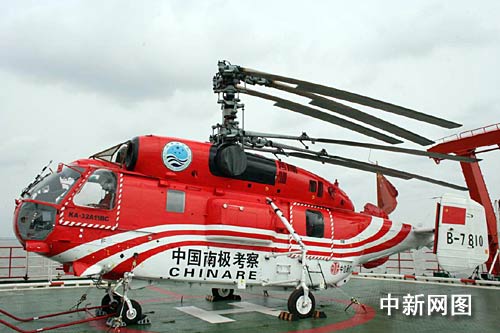 在“雪龍”號(hào)船尾的停機(jī)坪上,記者見到了中國南極考察首架自備卡-32直升飛機(jī)。由于在航行過程中需要存放在船上的機(jī)庫中,所以飛機(jī)螺旋槳的旋翼還未展開。船員告訴記者,該型直升機(jī)吊掛能力可達(dá)4噸,是以前船載機(jī)型的4倍左右,成為南極地區(qū)目前使用的最大噸位直升機(jī)。它可直接進(jìn)行船岸之間來回運(yùn)輸,更好地滿足南極新老三座考察基地的物資保障需求。另外,“雪龍”號(hào)此次科考任務(wù)同樣將配備兩架直升飛機(jī),除了該架自備卡-32外,另外一架從國外租借的直升飛機(jī)將在新西蘭上船。