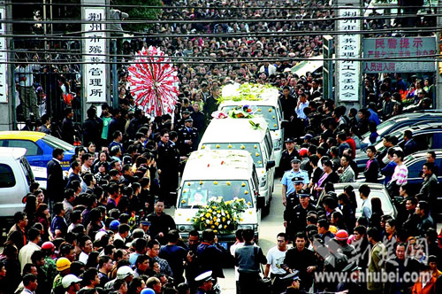 近萬(wàn)名學(xué)生和社會(huì)各界群眾自發(fā)地參加追悼會(huì)。人們?cè)缭绲刳s到荊州市殯儀館,手捧菊花、富貴竹,胸別白花,緩緩進(jìn)入靈堂,送英雄最后一程。