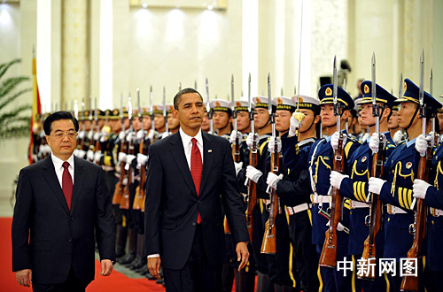 這是就職僅10個(gè)月的奧巴馬首次訪問中國(guó)。北大廳內(nèi),軍樂團(tuán)8點(diǎn)多即就位,再次認(rèn)真練習(xí)演奏著中美兩國(guó)國(guó)歌。鮮紅的地毯一側(cè),是密密麻麻的一百多名中外記者。在預(yù)計(jì)10分鐘的歡迎儀式中,奧巴馬將一睹中國(guó)人民解放軍三軍儀仗隊(duì)的風(fēng)范。
